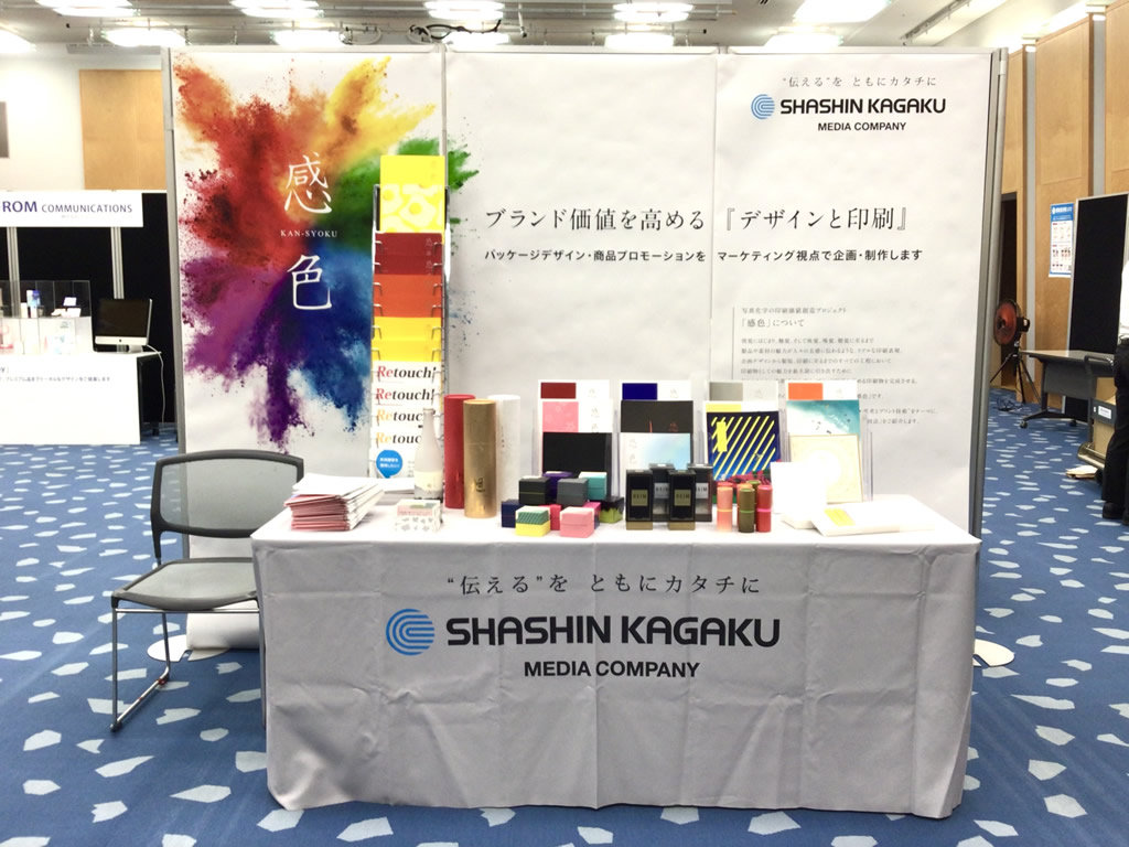 「ブランド価値を高めるデザインと印刷」という企画テーマのもと、写真化学からは仮想ブランドの商品パッケージや高品位印刷の印刷サンプルをご紹介しました。